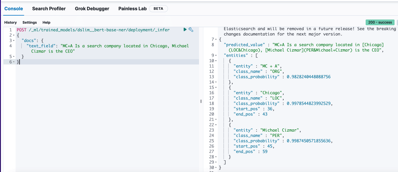 To use the model, navigate to Dev Tools and in Kibana run the following query: